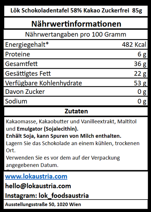 Zutaten: Kakaomasse, Maltit, Kakaobutter, Emulgator (Sojalecithin), natürliches Vanillearoma