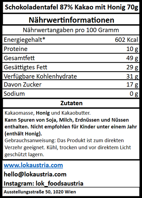 Zutaten: Kakaomasse, Orinoco-Honig, Kakaobutter, Sojalecithin, Vanilleextrakt