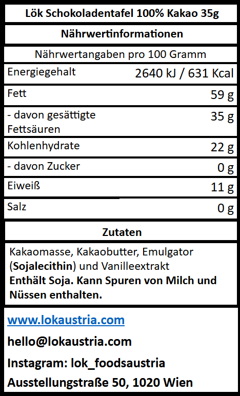 Genießen Sie Schokolade in ihrer reinsten Form mit Löks 100% Zartbitterschokolade , hergestellt aus erstklassigen kolumbianischen Kakaobohnen . Diese zuckerfreie , vegane und glutenfreie Schokolade ist ein kräftiger und belebender Genuss für Kakaoliebhaber , die sich nach einem natürlichen Energieschub und einem antioxidantienreichen Geschmackserlebnis sehnen.