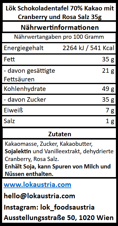 Zutaten: Kakaomasse, Rohrzucker, getrocknete Cranberries, rosa Salz, Kakaobutter, Sojalecithin, Vanilleextrakt