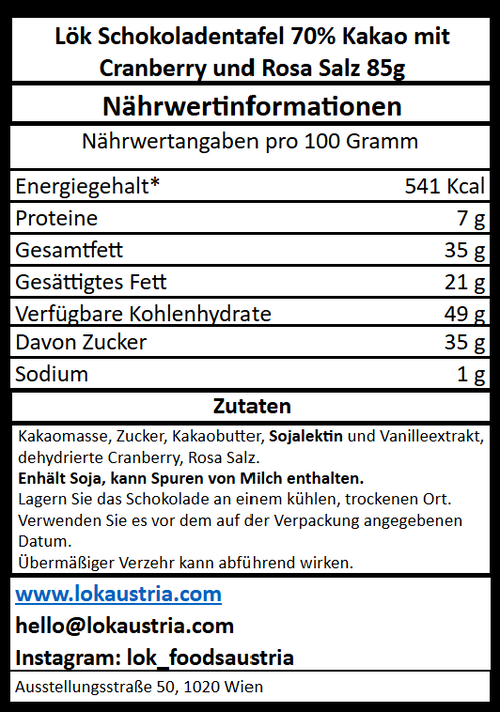 Zutaten: Kakaomasse, Rohrzucker, getrocknete Cranberries, rosa Salz, Kakaobutter, Sojalecithin, Vanilleextrakt
