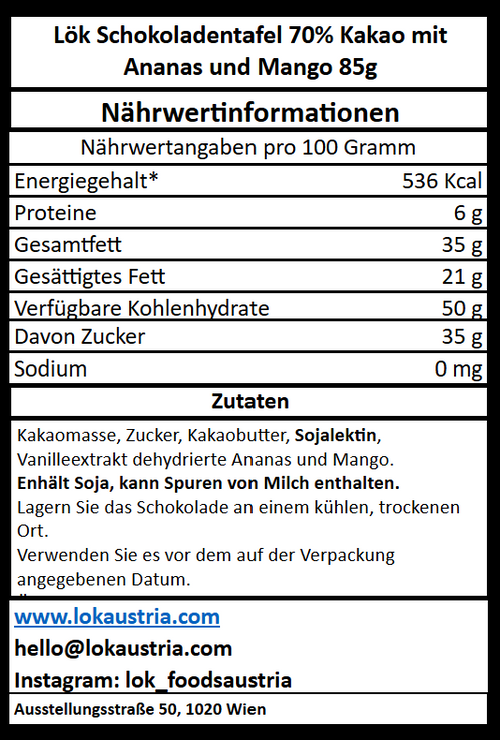 Zutaten: Kakaomasse, Rohrzucker, getrocknete Ananas, getrocknete Mango, Kakaobutter, Sojalecithin, Vanilleextrakt