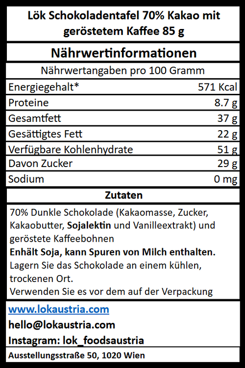 Zutaten: Kakaomasse, Rohrzucker, geröstete Kaffeebohnen, Kakaobutter, Sojalecithin, Vanilleextrakt