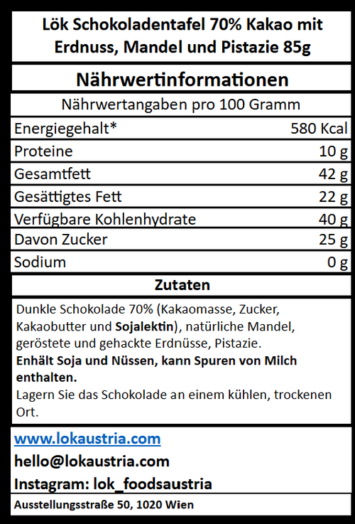 Zutaten: Kakaomasse, Rohrzucker, geröstete Pistazien, geröstete Mandeln, geröstete Erdnüsse, Kakaobutter, Sojalecithin, Vanilleextrakt