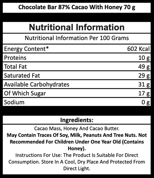 Zutaten: Kakaomasse, Orinoco-Honig, Kakaobutter, Sojalecithin, Vanilleextrakt