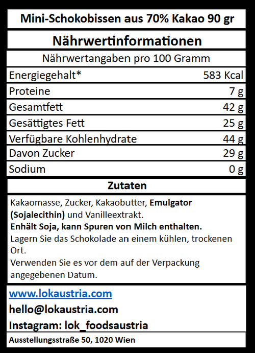 Zutaten: Kakaomasse, Rohrzucker, Kakaobutter, Sojalecithin, Vanilleextrakt