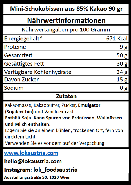 Zutaten: Kakaomasse, Rohrzucker, Kakaobutter, Sojalecithin, Vanilleextrakt