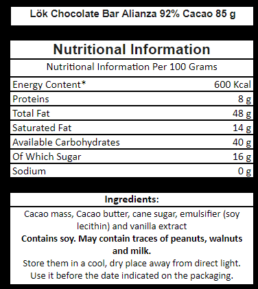 Alianza Dark Chocolate Bar | 92% Cacao | 85g