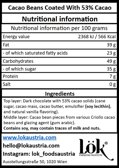 Indulge in the goodness of Lök Dark Chocolate Nibs, made from crunchy roasted cacao beans coated in rich 53% dark chocolate. These nibs are packed with antioxidants, fiber, and essential minerals, making them the ultimate superfood snack.