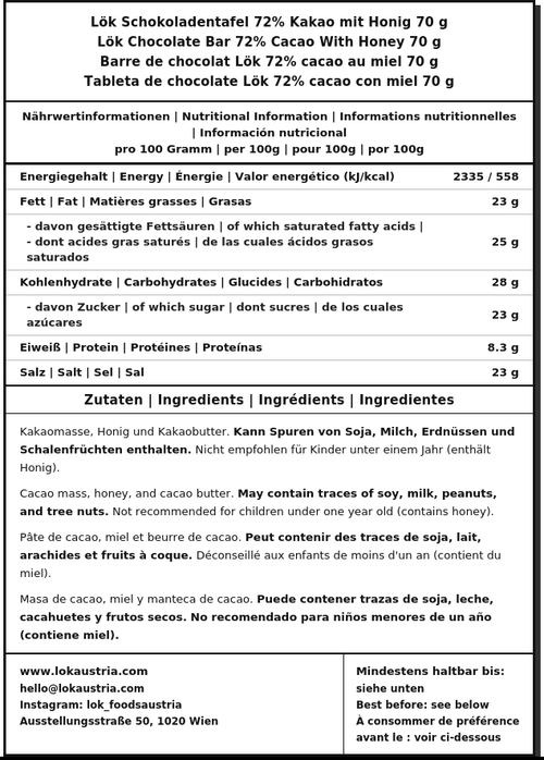 Ingredients: Cacao mass, honey, cacao butter, vanilla extract