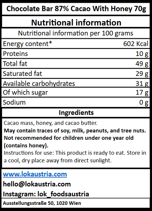 Savor the exquisite balance of Lök's 87% Dark Chocolate Bar, crafted with fine-flavor Colombian cacao and natural Orinoco honey from Colombia. This 70g bar combines the intensity of high-percentage dark chocolate with the delicate sweetness of unrefined honey, delivering a truly unique taste experience.