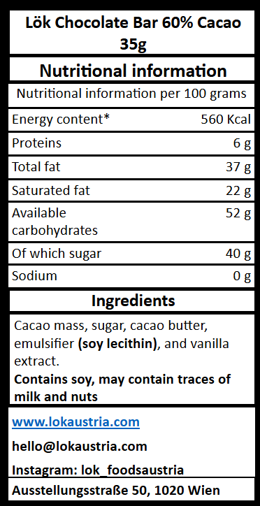 Ingredients: Cacao mass, cane sugar, cacao butter, soy lecithin, vanilla extract