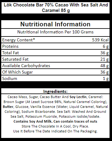 Indulge in Lök Dark Chocolate Bark (70% Fine-Flavor Cacao). This 85g indulgence balances the richness of Colombian cacao, smooth caramel swirls, and sparkling sea salt crystals for an unforgettable treat.
