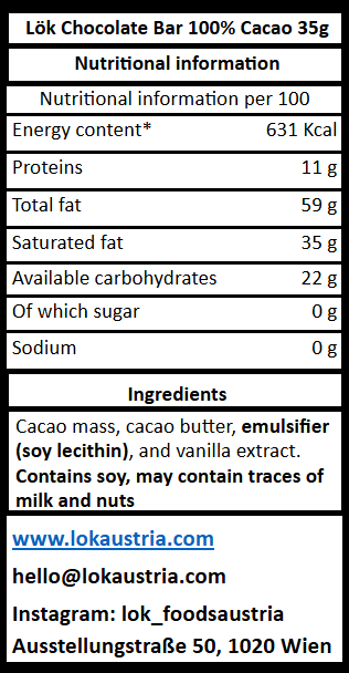 Ingredients: Cacao mass, cacao butter, vanilla extract