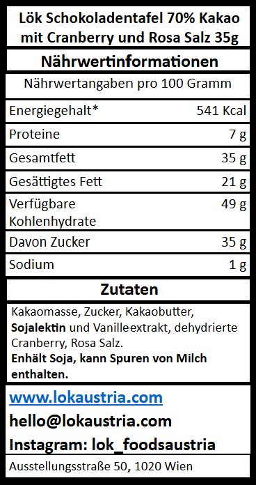 Zutaten: Kakaomasse, Rohrzucker, getrocknete Cranberries, rosa Salz, Kakaobutter, Sojalecithin, Vanilleextrakt