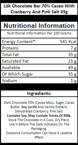 Indulge in the rich taste of Lök's 70% Dark Chocolate Bark, crafted with premium Colombian fine-flavor cacao. This vegan, gluten-free chocolate combines the deep intensity of fine chocolate with the tangy sweetness of cranberries and a delicate touch of pink salt, creating a refined and perfectly balanced taste experience.