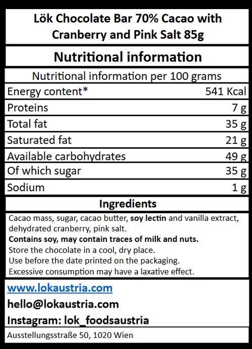 Embark on a flavor adventure with Lök's Dark Chocolate Bark (70% Cacao) with Cranberries & Pink Salt. This 85g bar combines the richness of fine Colombian cacao with the sweet-tart burst of cranberries and the subtle crunch of pink salt, delivering an unforgettable taste sensation.