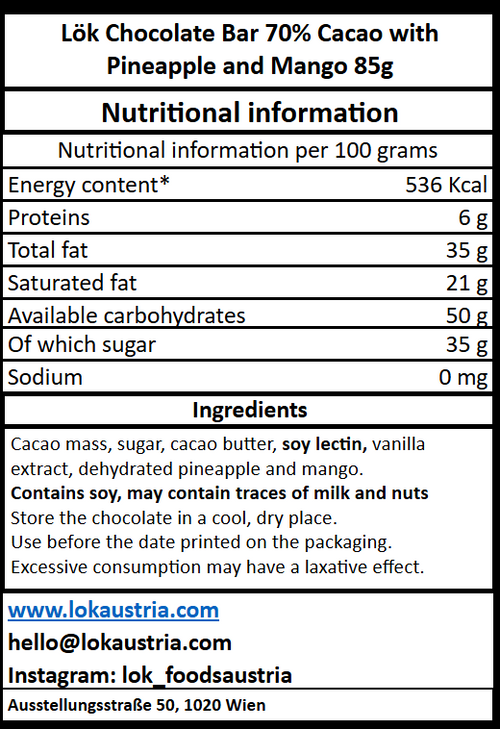 Escape to the tropics with Lök Dark Chocolate Bark (70% Cacao) with Pineapple & Mango. This 85g delight combines the richness of fine Colombian cacao with the sweet and tangy flavors of dehydrated pineapple and mango for a refreshingly exotic taste.