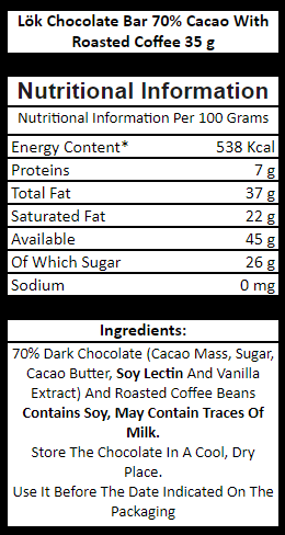 Experience the bold fusion of Lök's 70% Dark Chocolate Bark with Coffee Beans. This 35g treat blends rich Colombian cacao with the robust flavor of roasted coffee beans, creating an energizing and satisfying taste sensation that will awaken your senses.