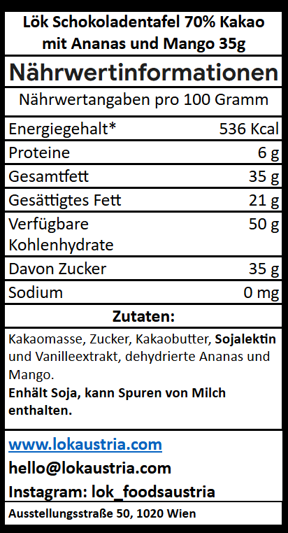 Zutaten: Kakaomasse, Rohrzucker, getrocknete Ananas, getrocknete Mango, Kakaobutter, Sojalecithin, Vanilleextrakt
