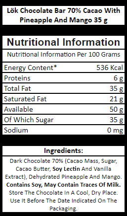 Experience the vibrant flavors of Lök Dark Chocolate Bark (70% Cacao) with Pineapple & Mango. This 35g tropical treat combines rich Colombian cacao with the sweet and tangy notes of dried pineapple and mango, delivering a refreshing and exotic taste sensation.