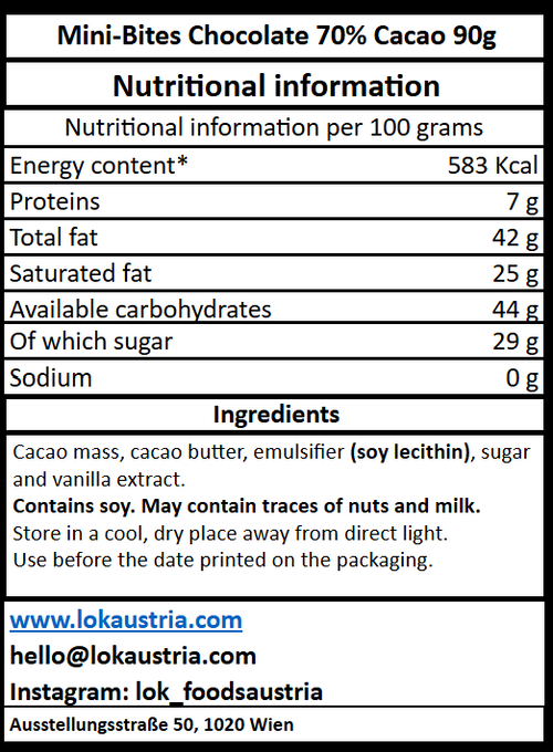 Ingredients: Cacao mass, cane sugar, cacao butter, soy lecithin, vanilla extract