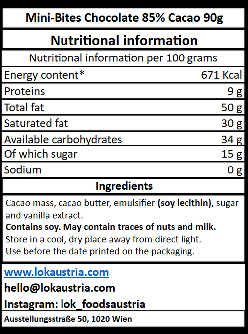 Savor the bold intensity of Lök's 85% Cacao Mini Bites, crafted with premium cacao beans sourced directly from Colombia. These 90g bite-sized treats deliver a rich, complex flavor perfect for chocolate connoisseurs seeking quality and convenience.